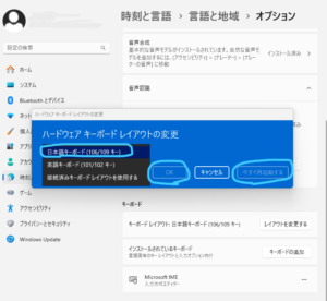 ここで”日本語キーボード”を選択。”OK”または”今すぐ再起動する”と選べますので、ほかに開けている必要なものがなければ”今すぐ再起動”を選び、そうでなければ”OK”を選択し他を閉じてから再起動します。