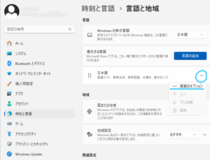 3.”日本語”がでてきます。”日本語”のところの右端の点々をクリックして”言語のオプション”をクリックしてください。